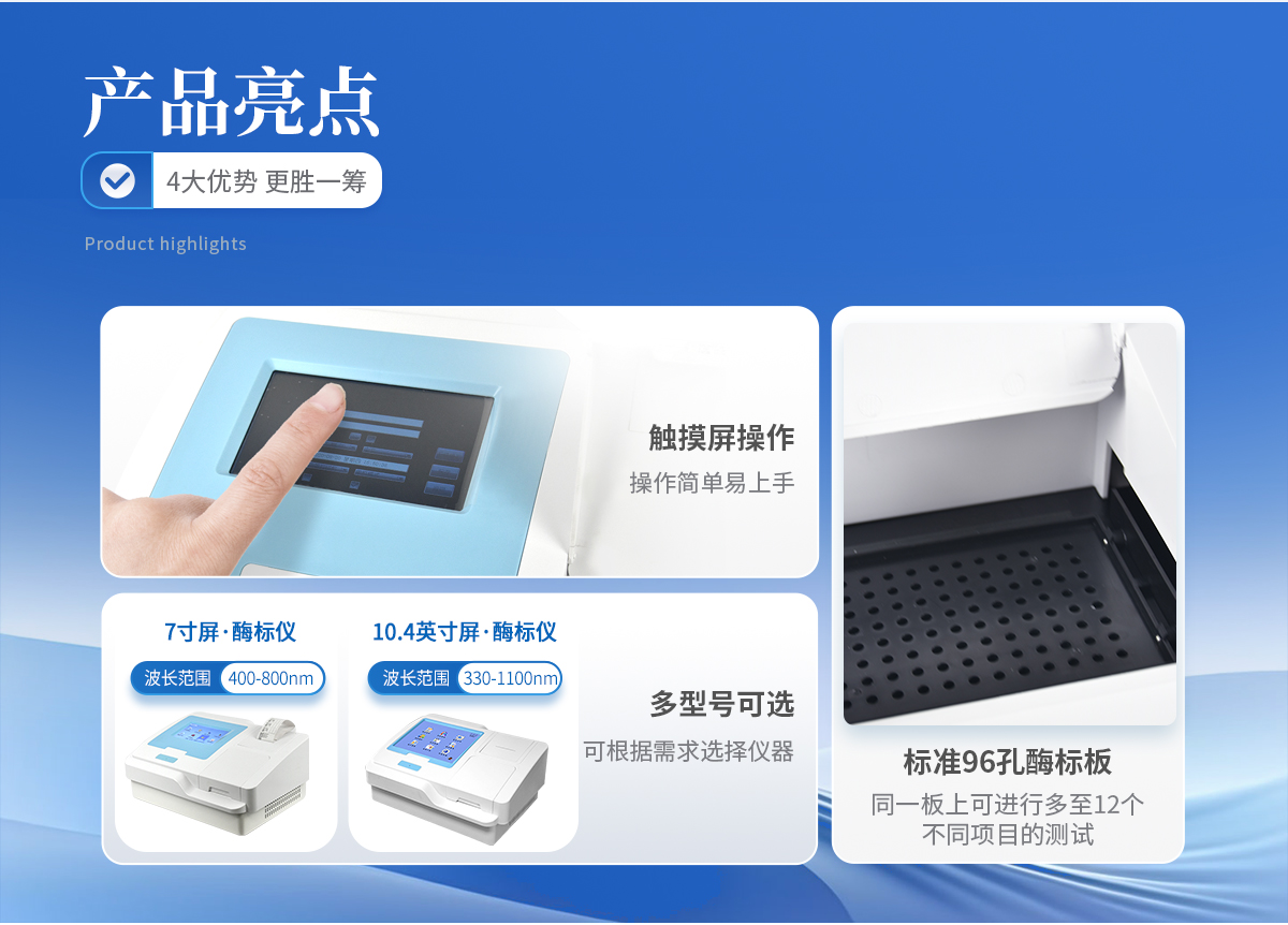 酶标仪是酶联免疫吸附实验的专用仪器,基于固定波长滤光片的酶标仪。波长范围从340 nm~750nm可满足不同的科研和临床使用。适用96孔酶标板,可满足不同通量的要求7英寸 液晶显示,易于使用,不需操作键盘,数据和程序可保存在仪器内,或者通过U盘导出。