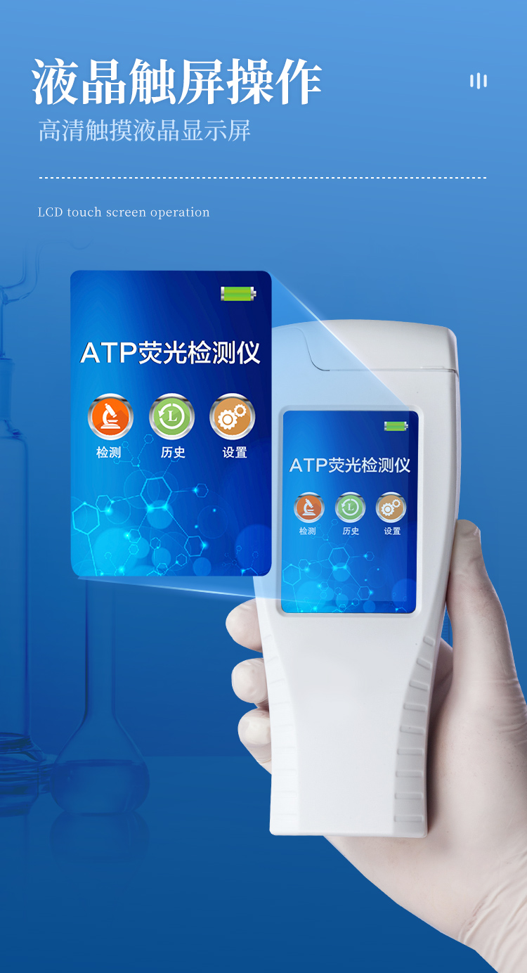 该设备为全新升级产品,安卓智能操作系统。操作采用生物化学反应方法检测ATP含量,ATP荧光检测仪基于萤火虫发光原理,利用“荧光素酶—荧光素体系”快速检测三磷酸腺苷(ATP)。ATP拭子含有可以裂解细胞膜的试剂,能将细胞内ATP释放出来,与试剂中含有的特异性酶发生反应,产生光,再用荧光照度计检测发光值,微生物的数量与发光值成正比,由于所有生物活细胞中含有恒量的ATP,所以ATP含量可以清晰地表明样品中微生物与其他生物残余的多少,用于判断卫生状况。