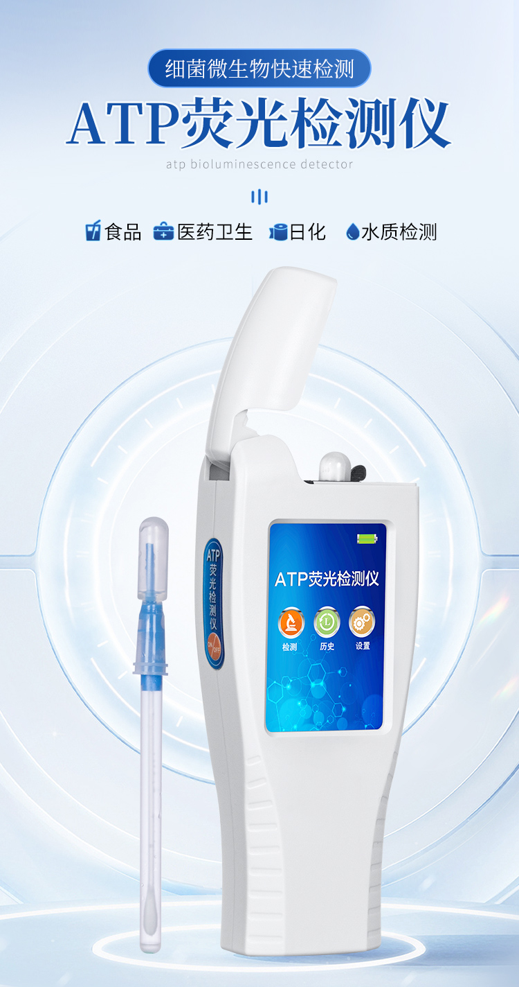 该设备为全新升级产品,大屏幕触摸显示屏,代替传统按键。操作采用生物化学反应方法检测ATP含量,ATP荧光检测仪基于萤火虫发光原理,利用“荧光素酶—荧光素体系”快速检测三磷酸腺苷(ATP)。ATP拭子含有可以裂解细胞膜的试剂,能将细胞内ATP释放出来,与试剂中含有的特异性酶发生反应,产生光,再用荧光照度计检测发光值,微生物的数量与发光值成正比,由于所有生物活细胞中含有恒量的ATP,所以ATP含量可以清晰地表明样品中微生物与其他生物残余的多少,用于判断卫生状况。